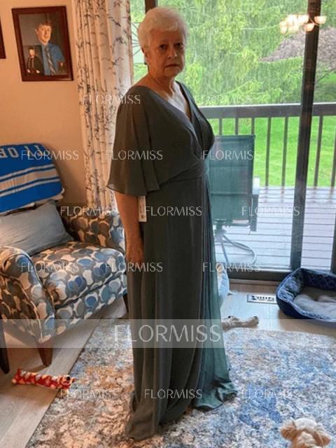 This floor-length chiffon mother of the bride dress features an A-line silhouette, offering a flattering and timeless look. The V-neckline adds a touch of elegance, while the half sleeves provide coverage and comfort. Pleating detail enhances the waistline, creating a graceful and feminine silhouette. Perfect for a sophisticated and chic appearance on your daughter's special day.