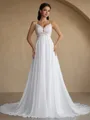 Graceful A-line wedding dress featuring a V-neck, sleeveless design, and delicate lace appliques. Crafted from flowing chiffon, the gown extends into a cathedral train, adding a touch of romance and sophistication to create an elegant bridal ensemble.
