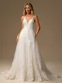 Radiate timeless elegance in this A-line wedding dress, featuring a flattering V-neckline, sleeveless design, and delicate lace appliques. Crafted from airy tulle, it showcases a graceful chapel train that adds an extra touch of romance. Perfect for a bride seeking classic beauty with a hint of whimsical charm on her special day.