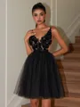 This A-line dress features a flattering V-neck and sleeveless design. Delicate lace appliques adorn the soft tulle overlay, adding a romantic touch. The corset bodice shapes the waist, while the short/mini length gives it a playful, elegant look-perfect for special occasions.