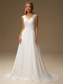 Radiate timeless elegance in this A-line wedding dress, boasting a flattering V-neckline and sleeveless design adorned with intricate lace appliques. Crafted from flowing chiffon, it cascades gracefully to the floor with a sweeping train, adding an extra touch of romance. Perfect for the bride seeking classic beauty and sophistication on her special day.
