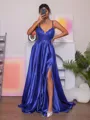 A-line V-neck Appliques Lace Sweep Train Silk Like Satin Porm Dress