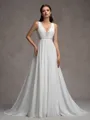Enchanting A-line wedding dress with a V-neck, sleeveless design, and intricate lace appliques. Crafted from elegant taffeta, the gown features a sweeping train, adding a touch of sophistication to the overall bridal look.