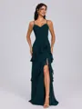 An A-line V-neck sleeveless bridesmaid dress with cascading ruffles and a floor-length chiffon design. This dress offers a flattering and flowing silhouette, with soft, romantic layers for an elegant, timeless look.