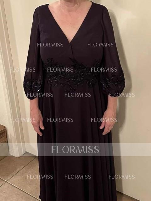 This ankle-length chiffon mother of the bride dress exudes timeless elegance. With its A-line silhouette and flattering V-neckline, it offers a graceful and sophisticated look. The long sleeves are adorned with delicate lace appliques, adding a touch of femininity and charm. Perfect for a mother who wants to look both chic and comfortable at her daughter's wedding.