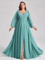 This A-line bridesmaid dress features a flattering V-neckline and elegant long sleeves. Made from soft chiffon with delicate pleats, it offers graceful movement and texture. The floor-length skirt creates a sophisticated and flowing silhouette-perfect for plus size bridal parties.