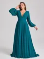 This A-line bridesmaid dress features a flattering V-neckline and elegant long sleeves. Made from soft chiffon with delicate pleats, it offers graceful movement and texture. The corset bodice shapes the waist, while the sweep train adds a romantic, flowing silhouette-perfect for plus size bridal parties.