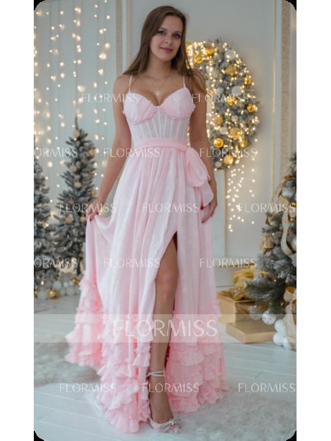 This elegant A-line bridesmaid dress features a flattering V-neckline and a sleeveless design, creating a soft, graceful look. Made from airy chiffon, it includes delicate ruffles that add texture and movement to the floor-length silhouette. The corset bodice provides a structured fit, accentuating the waist and enhancing the romantic feel, making it perfect for weddings and formal occasions.