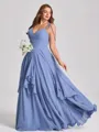 This A-line bridesmaid dress features a flattering V-neckline and sleeveless design. Made from soft chiffon, it-s adorned with delicate ruffles that add movement and feminine charm. The corset bodice shapes the waist, while the floor-length skirt creates an elegant and graceful silhouette-perfect for plus size bridal parties.