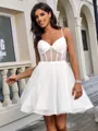 An elegant A-line cocktail dress crafted from airy tulle, featuring a flattering V-neckline and sleeveless design. This short/mini dress is adorned with a corset-style bodice that accentuates the figure beautifully, making it perfect for formal occasions or special events.