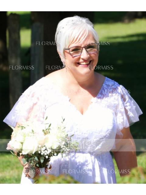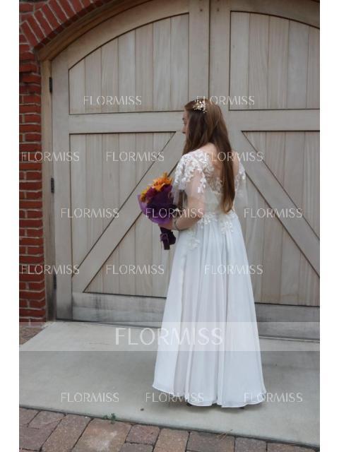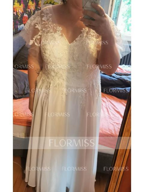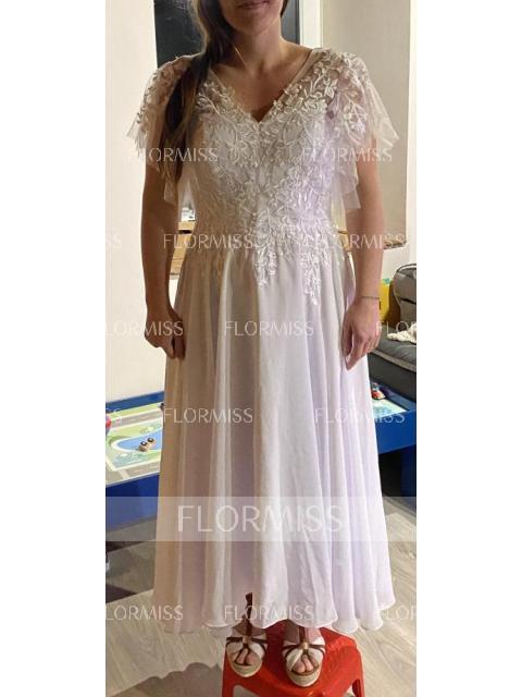 • A-line V-neck Short Sleeves Appliques Lace Asymmetrical Chiffon Wedding Dress