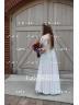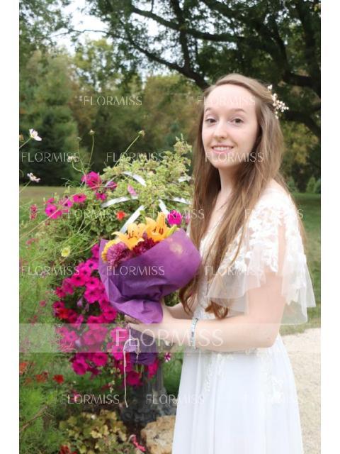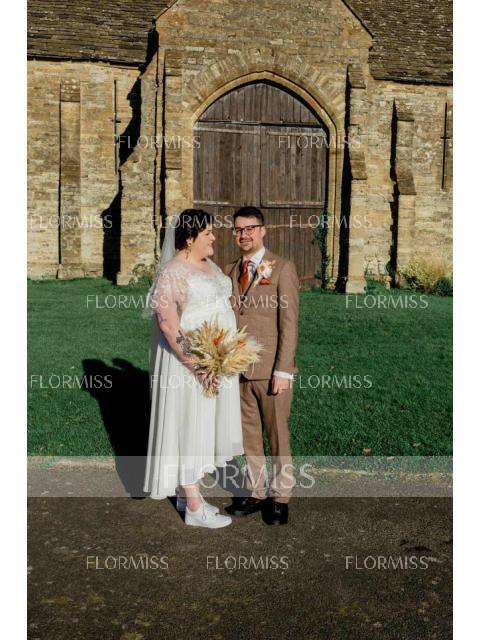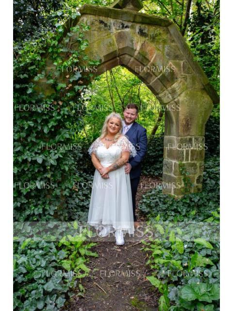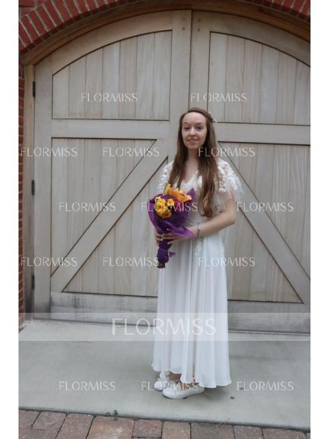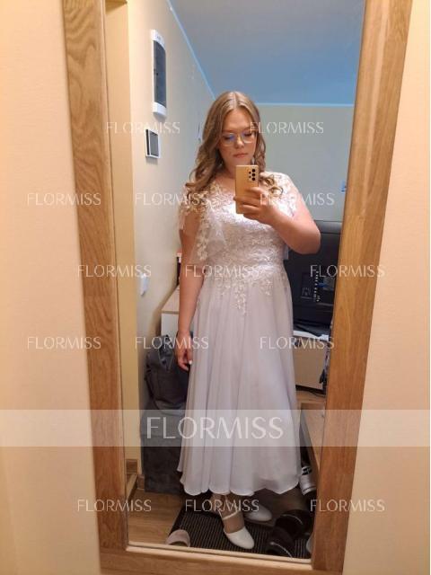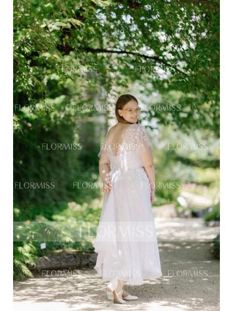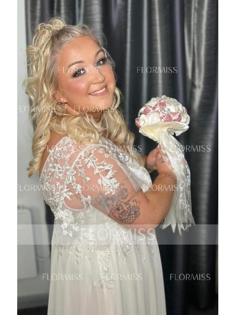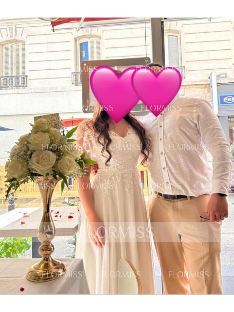 This graceful A-line wedding dress features a flattering V-neckline and delicate short sleeves that offer a soft, romantic touch. Crafted from lightweight chiffon, the bodice is adorned with intricate lace appliques that add elegant texture and detail. The asymmetrical hemline adds a modern and stylish flair, creating movement and visual interest. Perfect for a bride seeking a blend of classic romance and contemporary design.