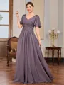 An elegant A-line Mother of the Bride dress featuring a V-neckline and short sleeves. The dress is adorned with intricate appliqu