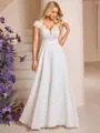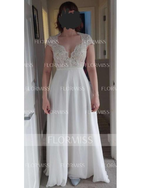 This romantic A-line wedding dress features a flattering V-neckline and delicate short sleeves for a soft, feminine look. The bodice is beautifully detailed with appliques lace that adds texture and elegance. Crafted from lightweight chiffon, the floor-length skirt flows effortlessly, creating a graceful and timeless silhouette. Ideal for both indoor and outdoor ceremonies, this gown blends classic charm with modern refinement for an unforgettable bridal appearance.