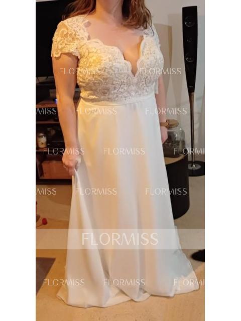 A-line V-neck Short Sleeves Appliques Lace Floor-Length Chiffon Wedding Dress