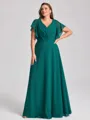 A-line V-neck Short Sleeves Pleated Floor-Length Chiffon Corset Plus Size Bridesmaid Dress
