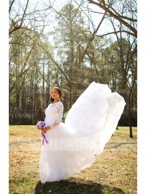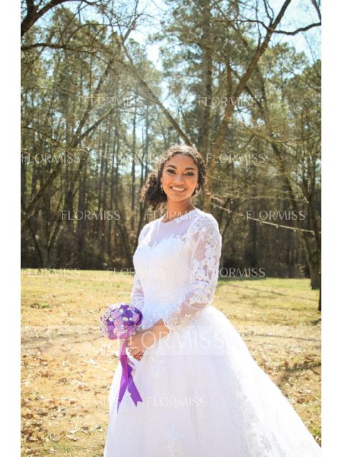 • Ball Gown Bateau Court Train Tulle Wedding Dresses With Appliques Lace