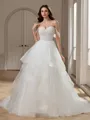 Sleeveless ball gown wedding dress with an off-the-shoulder neckline, cascading ruffles, a court train, and a corset bodice in tulle fabric.