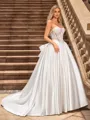 This enchanting wedding dress features a classic ball gown silhouette with a sweetheart neckline and a sleeveless design. Crafted from luxurious satin, it is accented with a charming bow and a corset back for a tailored fit. The court train adds a dramatic and elegant touch, perfect for a timeless and romantic bridal look.