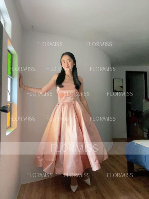 • Ball Gown Strapless Tea-Length Satin Homecoming Dress With Ruffles