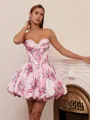 This ball-gown dress features a sweetheart neckline and a sleeveless corset bodice that shapes and defines the waist. The skirt is designed with pleats that add volume and texture, creating a dramatic silhouette. The short or mini length adds a youthful and elegant touch, perfect for parties, proms, or special occasions.