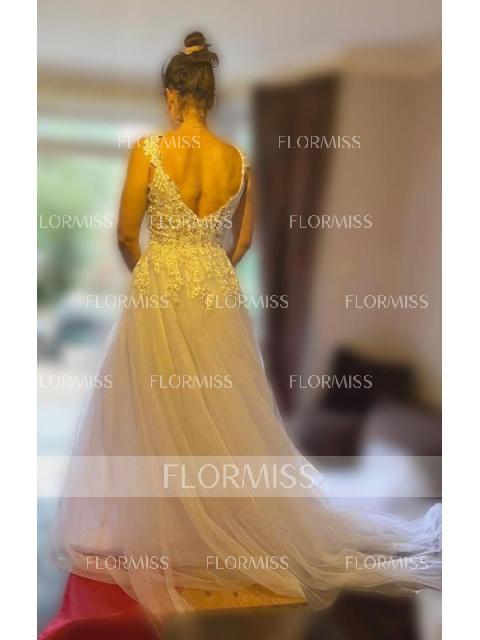 • Ball Gown V-neck Court Train Tulle Wedding Dresses With Appliques Lace