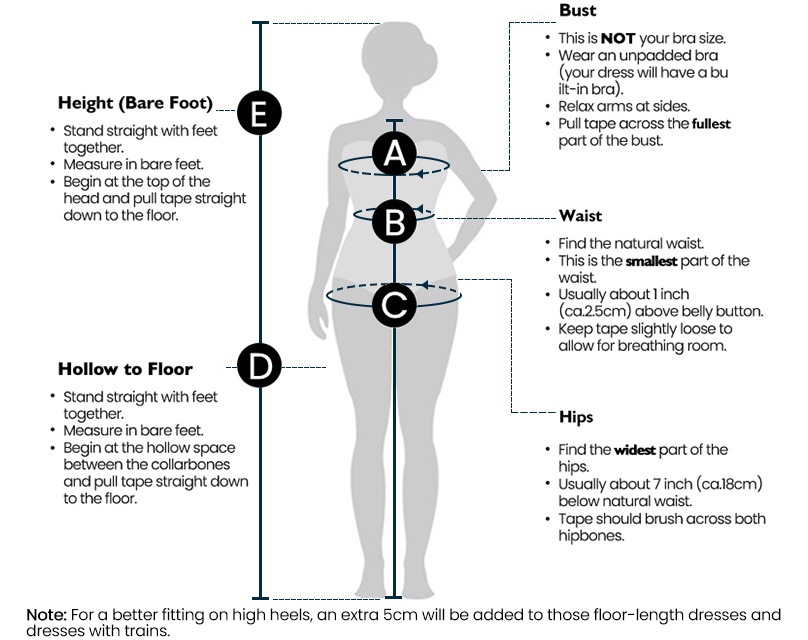 • Wear fitted clothing (like leggings and a tank top) when measuring and a supportive bra (whether you plan to wear a bra with the dress or not). If you have shapewear you plan to wear, wear this when measuring.