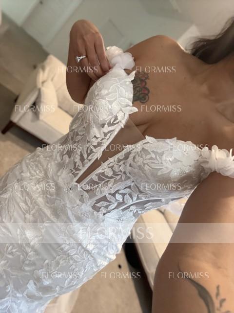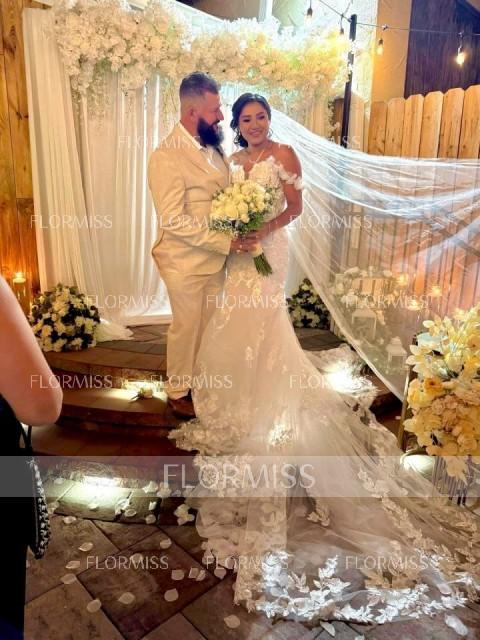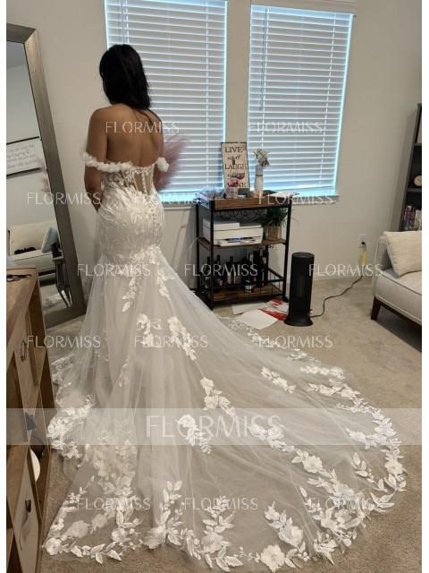 • Mermaid Off-the-Shoulder Appliques Lace Cathedral Train Tulle Corset Wedding Dress
