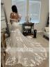 Make a statement in this mermaid wedding dress, featuring an off-the-shoulder neckline, sleeveless design, and intricate lace appliques. Crafted from luxurious tulle, it showcases a dramatic cathedral train and a flattering corset bodice. Perfect for a bride looking to exude timeless elegance with a touch of glamour on her special day.