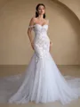 Alluring mermaid wedding dress with an off-the-shoulder neckline, sleeveless design, and delicate lace appliques. The gown extends into a cathedral train crafted from elegant tulle, while the corset detail enhances the overall romantic and sophisticated appeal of this stunning bridal ensemble.