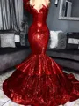 This mermaid dress features a stylish scoop neckline and a sleeveless design, offering a sleek and elegant look. Adorned with shimmering sequins, it adds a touch of glamour, while cascading ruffles create a dramatic, flowing effect. The sweep train enhances its sophisticated silhouette, making it perfect for formal events or special occasions.