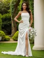 • Sheath/Column Ruched Spaghetti Straps Sleeveless Court Train Wedding Dresses