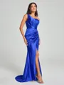 • Sheath/Column One-Shoulder Sweep/Brush Train Sleeveless Silk Like Satin Bridesmaid Dress