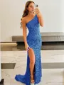 Sheath/Column One-Shoulder Sweep Train Velvet Sequins Prom Dresses With Leg Slit