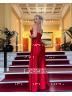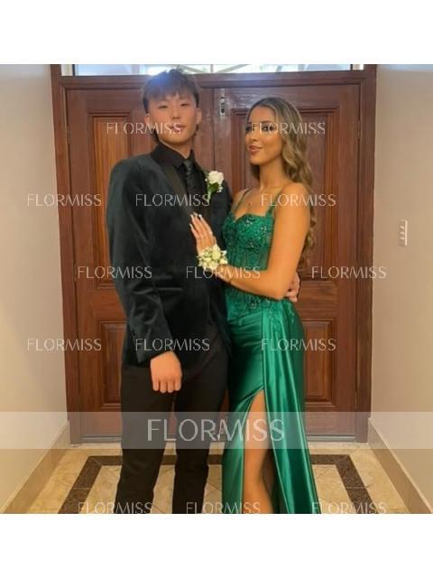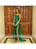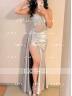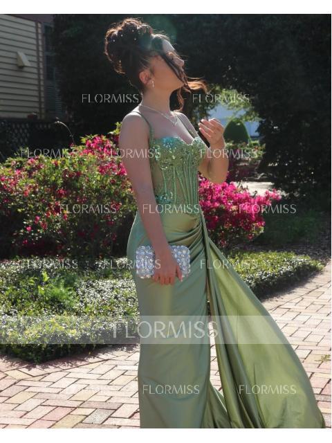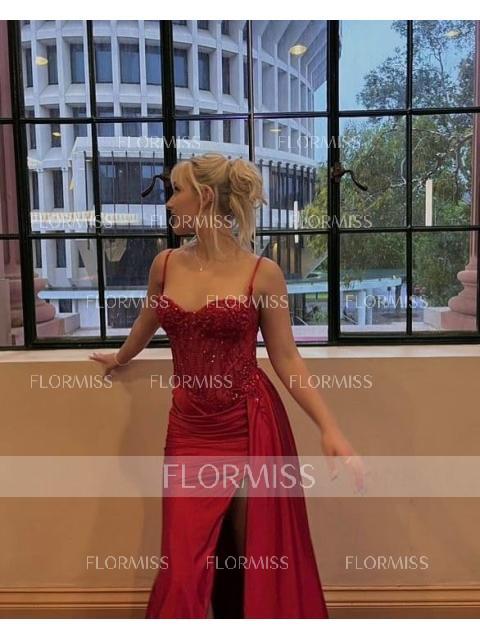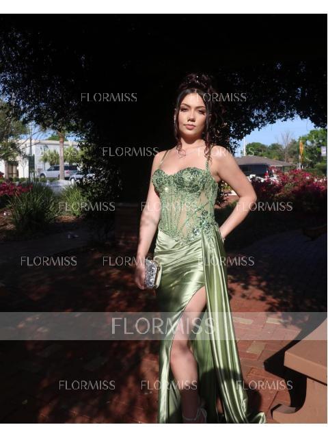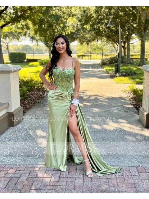 Sheath/Column Silk Like Satin Spaghetti Straps Sleeveless Sweep Train Leg Slit Porm Dress