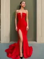 Sheath/Column Strapless Sweep Train Silk like Satin Prom Dresses With Leg Slit
