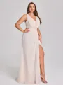 This sheath bridesmaid dress features a soft cowl neckline and sleeveless design for an elegant, modern look. Pleated chiffon adds flowing texture, while the corset bodice offers support and a flattering fit. The floor-length skirt creates a graceful silhouette-perfect for plus size bridal parties.