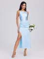 A sheath halter sleeveless bridesmaid dress made from pleated, silk like satin fabric. The ankle-length design offers a flattering, elegant silhouette, perfect for a formal wedding setting.
