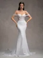 Elegant sheath wedding dress with an off-the-shoulder neckline, sleeveless design, and exquisite lace appliques. Crafted from stretch crepe, the gown extends into a cathedral train, while the corset detail adds a touch of refinement to create a sophisticated and modern bridal ensemble.