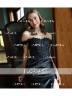 A form-fitting sleeveless sheath dress with an off-the-shoulder neckline, adorned with lace appliques. It includes a sweep train and is made from silk like satin with a corset for a structured fit.