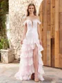 A breathtaking sheath dress with an off-the-shoulder, sleeveless design, crafted from soft tulle and adorned with intricate lace appliques. The corset bodice provides a structured, flattering fit, while the sweep train adds an elegant, flowing touch. Perfect for weddings or other formal occasions.