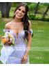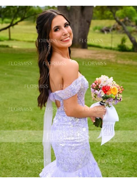 A breathtaking sheath dress with an off-the-shoulder, sleeveless design, crafted from soft tulle and adorned with intricate lace appliques. The corset bodice provides a structured, flattering fit, while the sweep train adds an elegant, flowing touch. Perfect for weddings or other formal occasions.