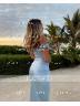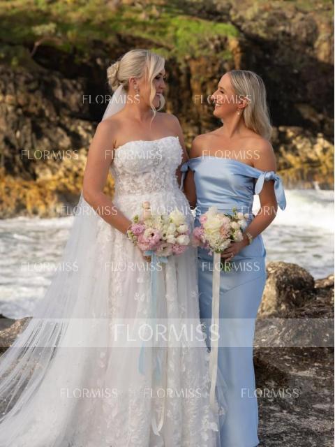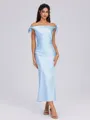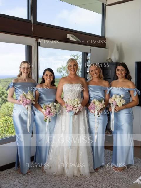 A sheath off-the-shoulder sleeveless bridesmaid dress with a bow detail and ankle-length design. Crafted from silk like satin, this dress combines elegance and comfort, offering a flattering fit with a touch of charm.