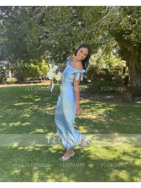• Sheath Off-the-Shoulder Bow Ankle-Length Silk Like Satin Bridesmaid Dress