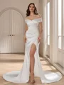 Off-the-shoulder, sleeveless sheath wedding dress with pleated details, a cathedral train, and a charmeuse corset.