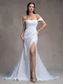 • Sheath Off-the-Shoulder Pleated Court Train Charmeuse Wedding Dress