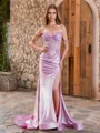 • Sheath Off-the-Shoulder Rhinestone Sweep Train Metallic Satin Corset Porm Dress