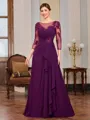 A sophisticated sheath Mother of the Bride dress featuring a scoop neckline and 3/4 sleeves. The dress is beautifully detailed with delicate appliqu