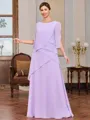 A graceful sheath Mother of the Bride dress featuring a scoop neckline and 3/4 sleeves. The dress is designed with cascading ruffles that add texture and movement, creating a stunning, feminine look. Made from lightweight chiffon, it offers a comfortable and flattering fit. The floor-length silhouette enhances the elegance and sophistication, making it an ideal choice for a memorable and stylish appearance on the big day.
