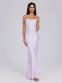 A sheath bridesmaid dress with delicate spaghetti straps and a sleeveless design. This ankle-length dress offers a sleek and modern silhouette, perfect for a chic and understated look at any formal event.